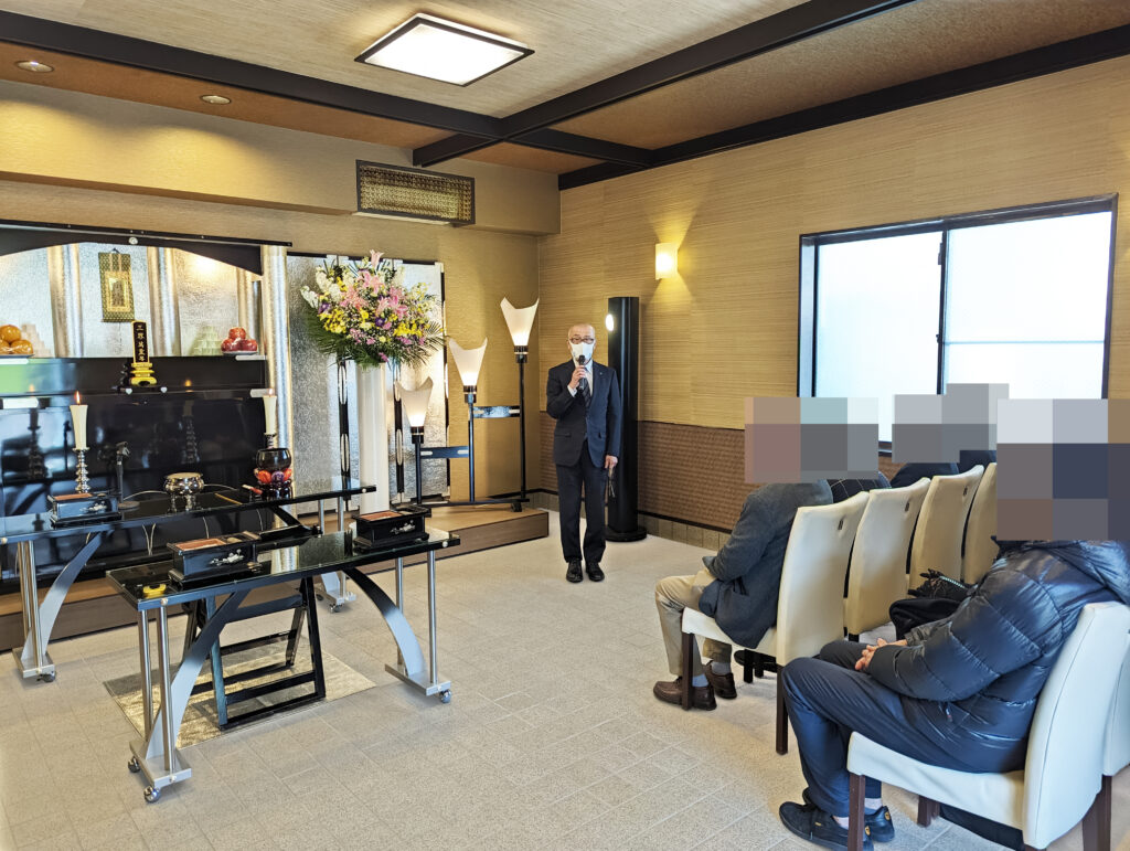 読経終了後、松福寺様より法話を賜りました。その後、合祀墓へと移動し、松福寺様による読経の中、合祀・焼香と儀式は粛々と進行しました。合祀式の後はご参加いただいたご家族の皆様に、福祉葬祭からお花のプレゼントをさせていただきました。