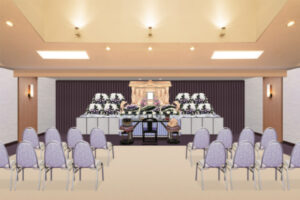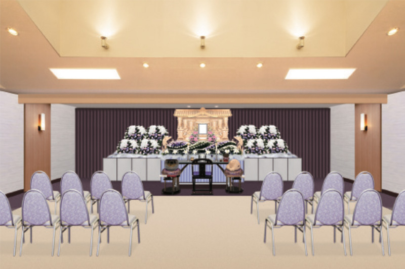 メモリアルルーム越谷は、1日1組貸切の式場です。優しい照明が包みこむ、落ち着きある空間には荘厳な白木祭壇が設置されています。受付、式場、会食室の全てが1フロアに設けられており、最後のひとときを心地よくお過ごしいただけます。