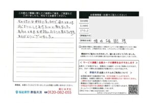 福祉葬祭をご利用いただいた、お客様の声の一部をご紹介させていただきます。 お客様よりいただきました貴重なご意見を真摯に受け止め、今後のサービス向上に努めてまいります。