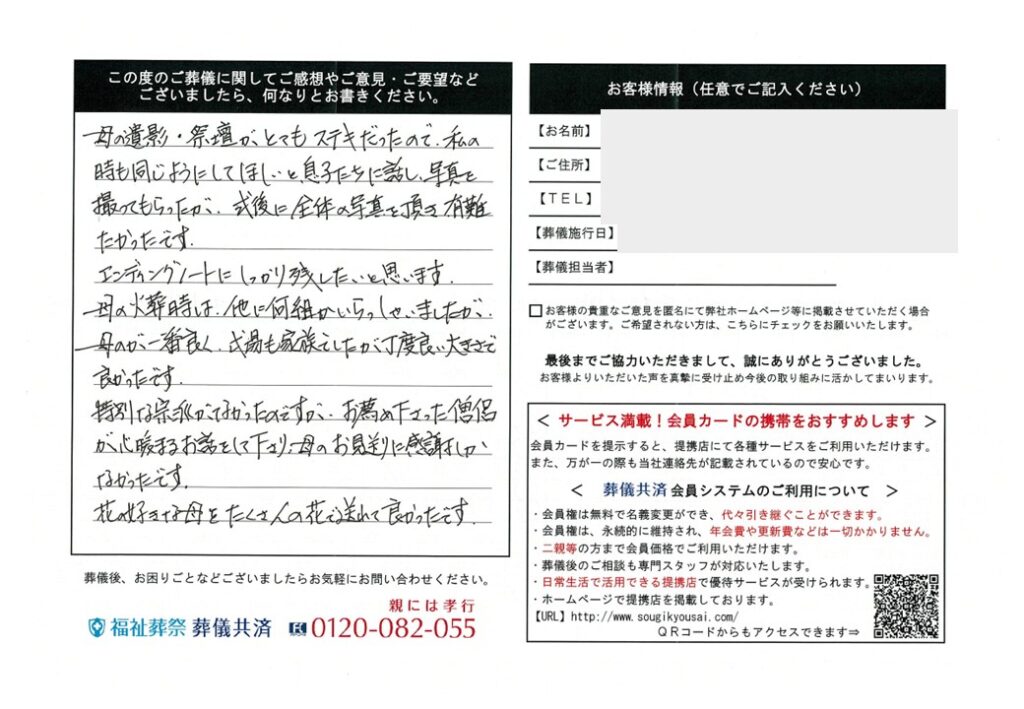 祭壇がとてもステキだった2025.12.06 母の遺影・祭壇がとてもステキだったので、私の時も同じようにしてほしいと息子たちに話し、写真を撮ってもらったが、式後に全体の写真を頂き有難たかったです。エンディングノートにしっかり残したいと思います。 母の火葬時は、他に何組かいらっしゃいましたが、母のが一番良く、式場も家族でしたが丁度良い大きさで良かったです。特別な宗派がなかったのですが、お薦め下さった僧侶が心暖まるお話をして下さり、母のお見送りに感謝しかなかったです。花の好きな母をたくさんの花で送れて良かったです。