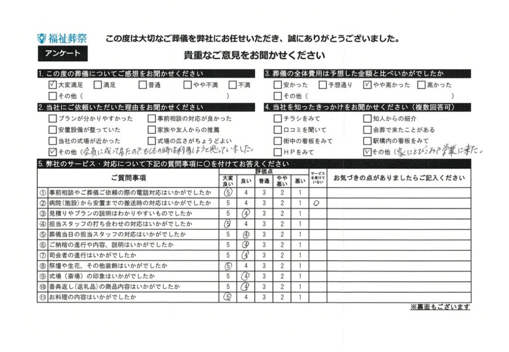 【草加市】12年前に入会していて助かった2025.12.06 お世話に成りました。12年前に入会したのが、とても助かりました。 今年13回忌を迎えた義母の葬儀の時はお金を積み立てて互助会を利用したんですが、私はとても悪い印象しか残っていませんでした。すぐ互助会を辞めました。そこへ飛び込みの営業で自宅に来たので、すぐ入会しました。良い選択だ ったと思ってます。 葬儀に参列してくれた人達からもとても、評判が良く家族葬じゃなくて良かったと思いました。本当にありがとう御座居ました。