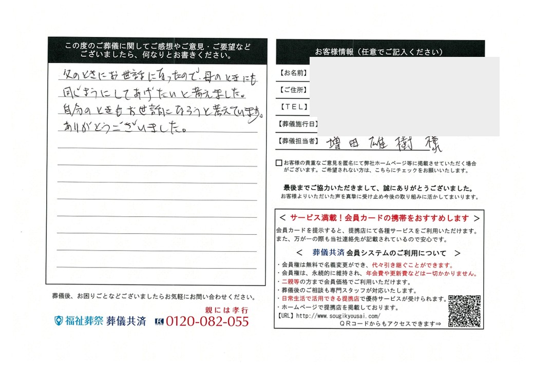 【桶川市】父の時にお世話になったので、母も同じように2026.03.05 父のときにお世話になったので、母のときにも同じようにしてあげたいと考えました。 自分のときもお世話になろうと考えています。ありがとうございました。